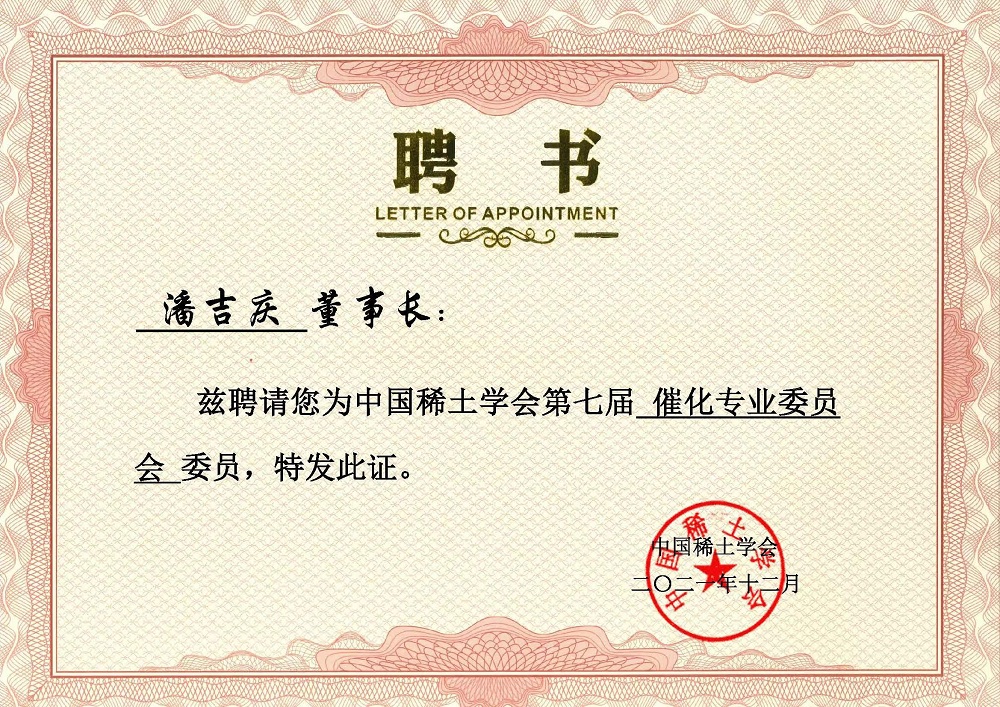 【概要描述】近日,公司董事長潘吉慶先生被中國稀土學(xué)會聘為“第七屆催化專業(yè)委員會委員”。
